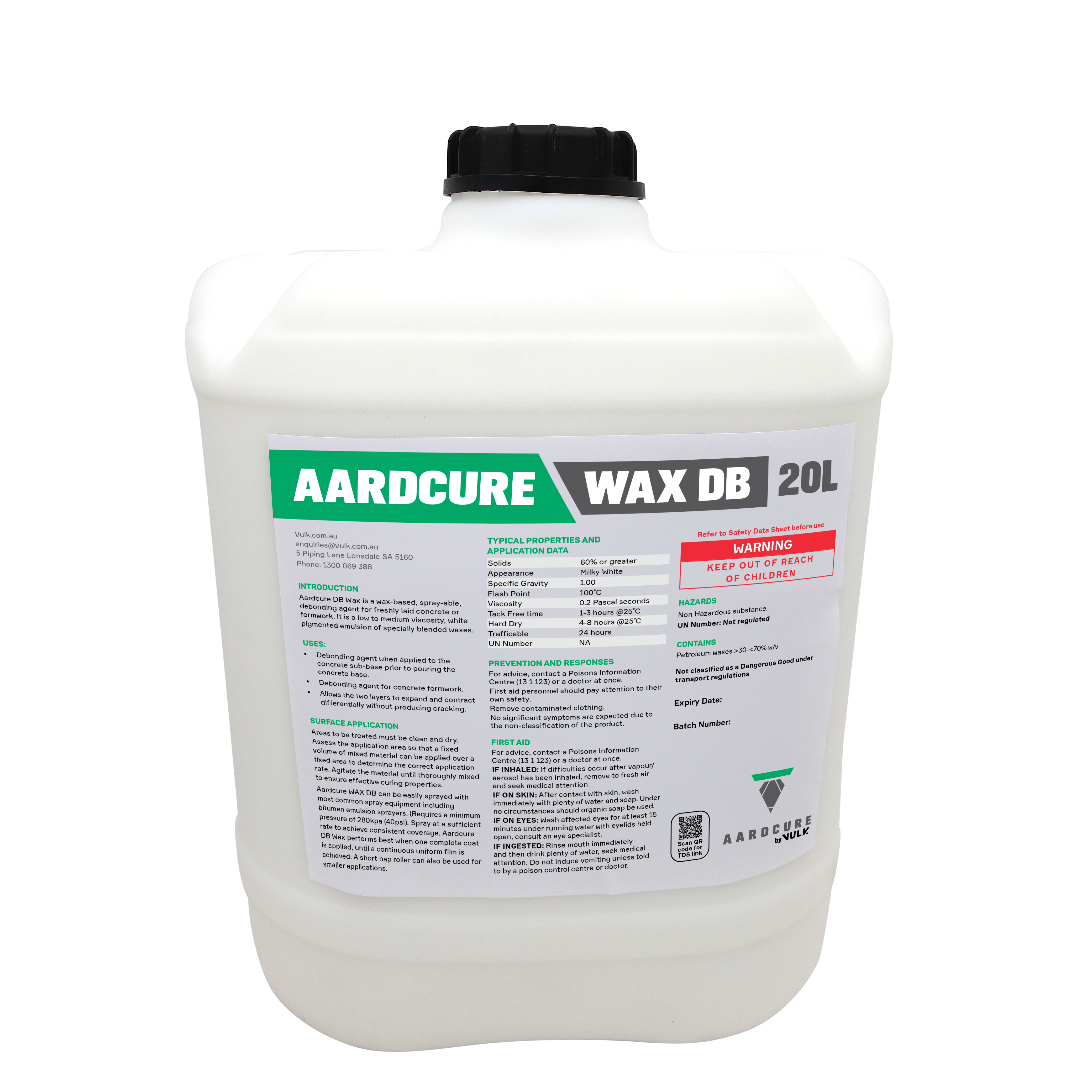 The Aardcure WAX DB Water based curing compound is a wax-based, spray-able, debonding agent for freshly laid concrete or formwork. It is a low to medium viscosity, white pigmented emulsion of specially blended waxes. Easy to apply, and prevents adhesion between concrete or formwork.
